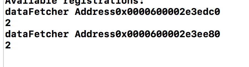 DataFetcher.self์ ๋ํด resolve๋ฅผ ํธ์ถํ ๋ ๋ง๋ค ํญ์ ์๋ก์ด ์ธ์คํด์ค๊ฐ ๋ฐํ๋๋ค. (๋ฉ๋ชจ๋ฆฌ ์ฃผ์๊ฐ ๋ค๋ฆ)