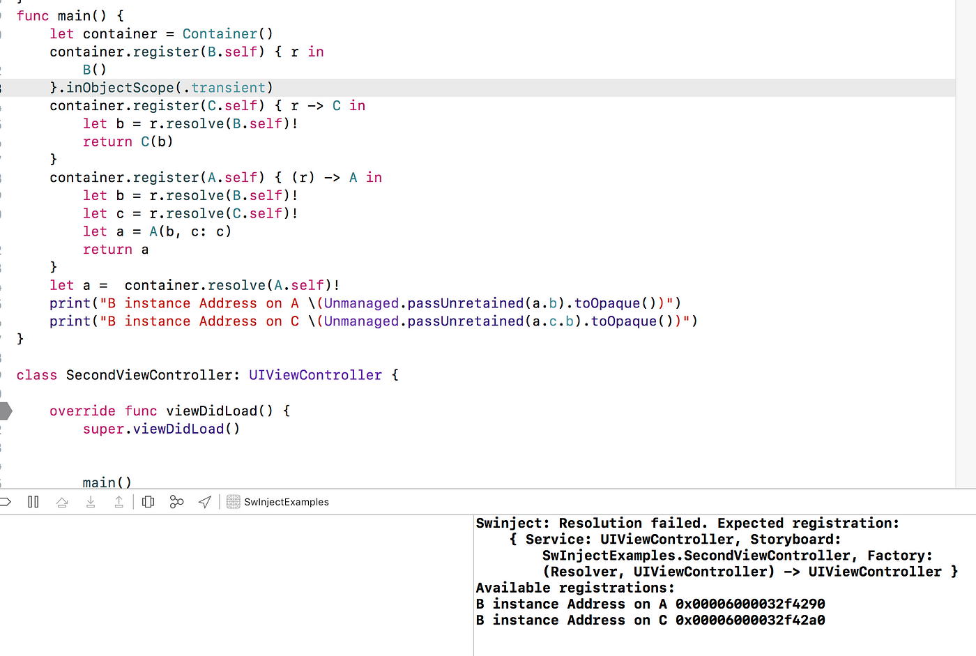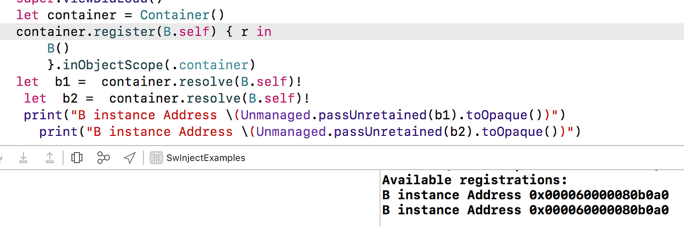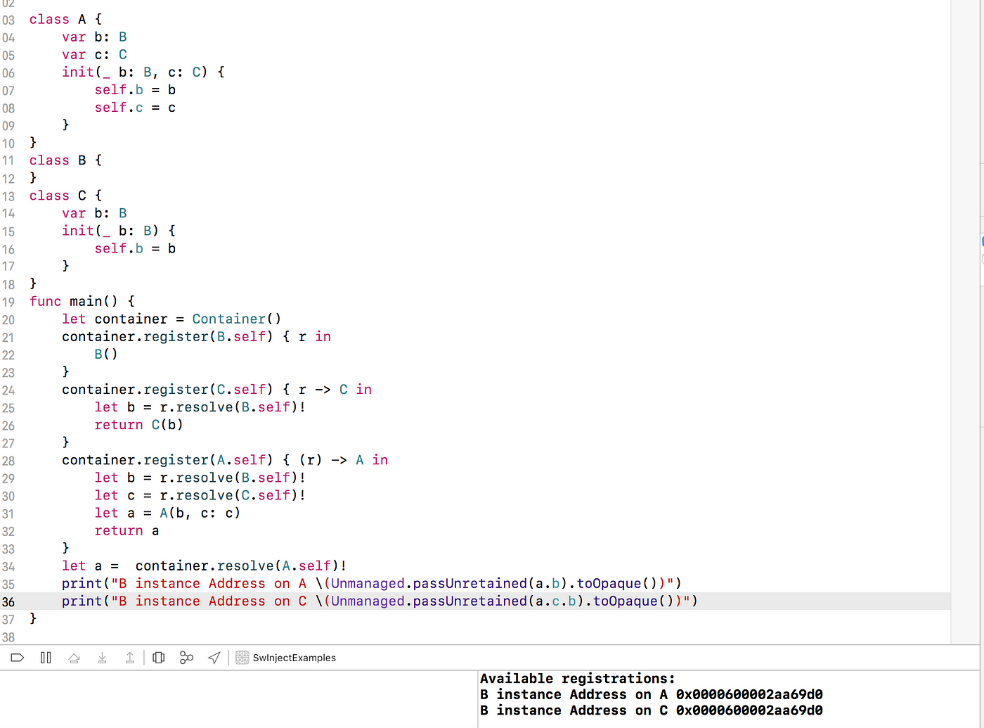 - C๋ฅผ resolve : ๋จผ์ , C์ ์์กดํ๊ณ ์๋ B๋ฅผ ํ์ธํ๋ค. ๊ทธ๋ฐ ๋ค์ ๊ณต์ ์ปจํ ์ด๋๋ฅผ ํ์ธํ์ฌ ์ฃผ์๊ฐ (0x0000600002aa69d0)์ธ B ์ธ์คํด์ค๋ฅผ ์ฐพ๋๋ค. ์ด B ์ธ์คํด์ค๋ฅผ C ์์ฑ์ ํ ๋นํ๊ณ C ๊ฐ์ฒด๋ฅผ ์์ฑํ๋ค.